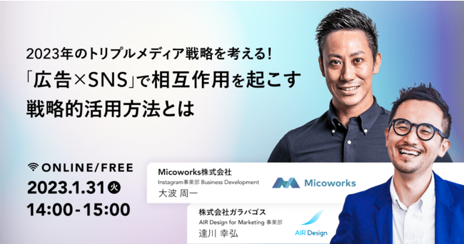 マーケティングのプロによるAIを活用した広告クリエイティブ制作・改善サービス「AIR Design(エアデザイン)」を展開する株式会社ガラパゴスは、Micoworks株式会社と共催で、1月31日(火) 14時より、無料オンラインセミナー【2023年のトリプルメディア戦略を考える!「広告×SNS」で相互作用を起こす戦略的活用方法とは?】を開催します。