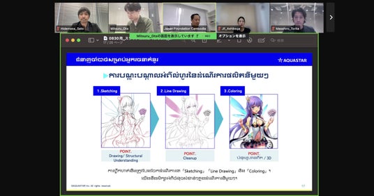 株式会社アクアスター株式会社アクアスター(東京都中央区、代表取締役社長:原田 弘良)は、2024年8月30日(金)にカンボジアの若手クリエイターを対象としたオンライン技術講習会を開催しました。本講習会は、国際交流基金(JF)が実施する「次世代共創パートナーシップ-文化のWA 2.0」事業の一環で行われ、プロのイラストレーターを目指す参加者に、日本文化の理解を深める貴重な機会を提供しました。