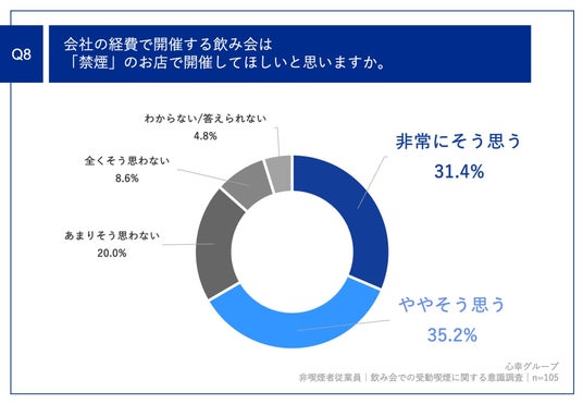 「Q8.会社の経費で開催する飲み会は「禁煙」のお店で開催してほしいと思いますか。」(n=105)と質問したところ、