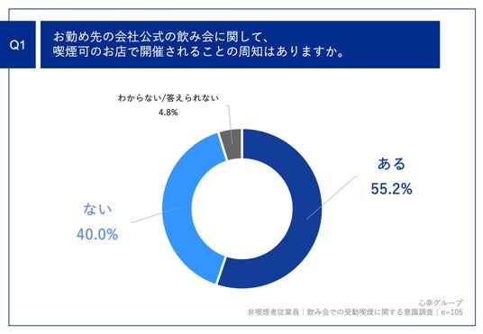 「Q1.お勤め先の会社公式の飲み会に関して、喫煙可のお店で開催されることの周知はありますか。」(n=105)と質問したところ、
