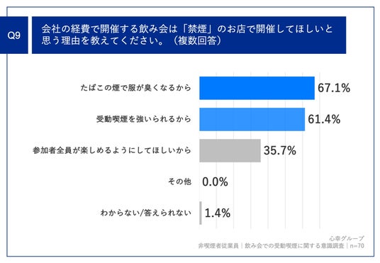 「Q9.会社の経費で開催する飲み会は「禁煙」のお店で開催してほしいと思う理由を教えてください。(複数回答)」(n=70)と質問したところ、
