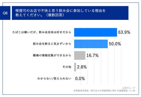 「Q6.喫煙可のお店で不快と思う飲み会に参加している理由を教えてください。(複数回答)」(n=36)と質問したところ、