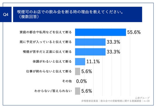 「Q4.喫煙可のお店での飲み会を断る時の理由を教えてください。(複数回答)」(n=18)と質問したところ、