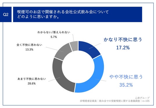 「Q2.喫煙可のお店で開催される会社公式飲み会についてどのように思いますか。」(n=105)と質問したところ、