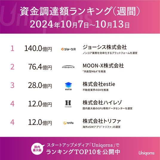 国内最大級のスタートアップメディア「Uniqorns(ユニコーンズ)」が2024年10月7日~10月13日のスタートアップ資金調達状況をランキング形式で発表