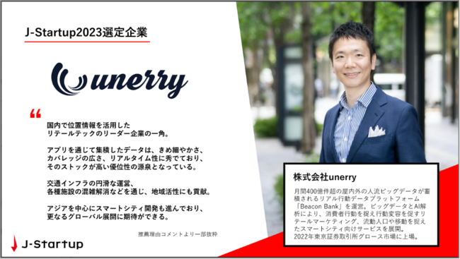 リアル行動データプラットフォーム「Beacon Bank」を運営する株式会社unerry(住所:東京都港区虎ノ門、代表取締役社長CEO: 内山 英俊、以下unerry)は、経済産業省が推進するスタートアップ企業の育成支援プログラム「J-Startup 2023」選定企業に選ばれました。