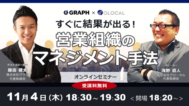 地域の中小・中核企業を対象に経営コンサルティング事業を行う株式会社グローカル(東京都渋谷区、以下グローカル)は、中小企業の経営者・営業責任者を対象に、目標を達成する強い営業組織の作り方を解説する無料オンラインセミナーを、2022年8月9日(火)18:30から開催します。今回は、スタートアップから大企業まで営業組織改革のコンサルティングを行う株式会社グラフの藤田健太氏をお招きし、具体的な事例を交えながらお話しいたします。