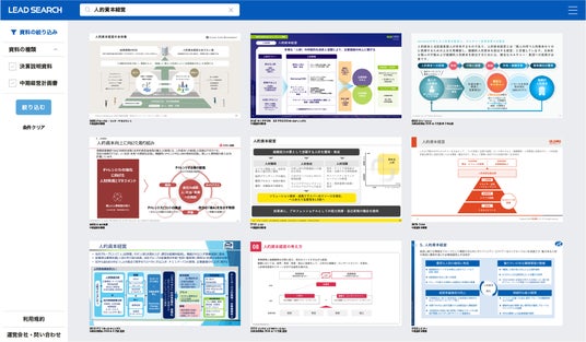 「LEAD SEARCH」は決算説明資料や中期経営計画書などのIR資料を、「内容の関連度」と「資料の完成度」の2つ観点でスライド単位の検索ができるWEBサービスです。