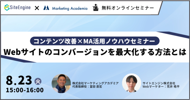 「自己表現にテクノロジーとアイデアを」を経営理念としてWebマーケティング支援サービスを提供するサイトエンジン株式会社(本社:東京都世田谷区 代表取締役:毛塚 智彦)は、2022年8月23日(火)15:00~16:00に、株式会社マーケティングアカデミア(本社:東京都渋谷区 代表取締役:富田 直宏)との” コンテンツ改善×MA活用ノウハウセミナー Webサイトのコンバージョンを最大化する方法とは” を開催します。