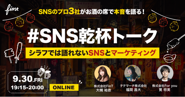 そこで今回は、テテマーチ株式会社 福間 昌大様、株式会社For you 筧 将英様をお招きし、SNSのプロ3社がお酒の席で本音を語る「#SNS乾杯トーク」ウェビナーを開催いたします。「SNSとマーケティング」をテーマに、お酒片手に3社でトークセッションを行って参ります。ご視聴者の皆様もぜひお酒を飲みながら、ご気軽にご参加いただけますと幸いです。