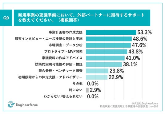 Q9.新規事業の稟議準備において、外部パートナーに期待するサポートを教えてください。(複数回答)」(n=105)と質問したところ、