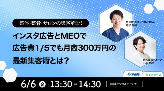 株式会社ロカオプ(本社:東京都新宿区新宿 代表取締役:縣将貴、以下:ロカオプ)は、整体院 智圭-TOMOKA-(本社:埼玉県吉川市 代表:阿部智昭)と共催で、6月6日(金)13:30より無料のオンラインセミナー『整体・接骨・サロンの集客革命!インスタ広告とMEOで広告費1/5でも月商300万円の最新集客術とは?』を開催いたします。