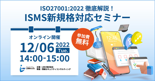 LRM株式会社(以下 LRM、本社:兵庫県神戸市、代表取締役CEO:幸松哲也)は、「ISO27001:2022徹底解説!ISMS新規格対応セミナー」を12月6日(火)14時から開催いたします。9年ぶりとなるISO27001の改訂に伴い、改訂の背景や、新規追加された管理策の解説、ISMS認証取得企業が対応すべき事項をご紹介します。Zoomでの無料オンラインセミナーですので、ぜひお気軽にご参加ください。