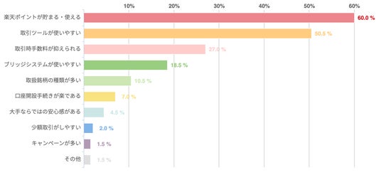 - 楽天証券の良い点としては、「楽天ポイントが貯めやすい・投資に活用しやすい(60.0%)」や「取引ツールが使いやすい(50.5%)」が多くのユーザーから寄せられた。また、「取引手数料の安さ(27.8%)や「自動入出金機能を始めとするブリッジシステムの使いやすさ(18.5%)」も高い評価を受けている。