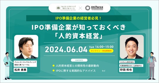 企業フェーズに合わせて持続的な成長の基盤を構築する「ガバナンスグロース」を企業ミッションに掲げるUniforce株式会社(代表取締役CEO:砂田 和也、以下「当社」)は、6月4日(火)にIPO準備企業の経営層を対象としたオンラインセミナーを開催いたします。