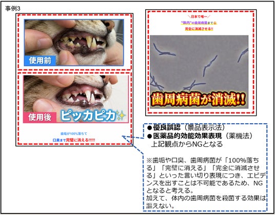例8:歯みがき類において、ブラッシング効果である旨の記載なしに歯を白くするかのような表現(マウスウォッシュ商材)。また、物理的効果ではなく成分にて抗菌作用があるかのような表現。その他、歯が揺れるほどに弱っていた歯茎が固いものを噛めるほどに強くなったという、効果として誇大な表現。