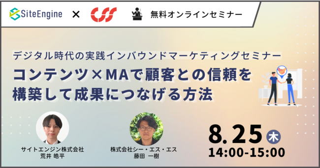 「自己表現にテクノロジーとアイデアを」を経営理念としてWebマーケティング支援サービスを提供するサイトエンジン株式会社(本社:東京都世田谷区 代表取締役:毛塚 智彦)は、2022年8月25日(木)14:00~15:00に、株式会社シー・エス・エス(本社:東京都品川区 代表取締役:富田 直宏)との” デジタル時代の実践インバウンドマーケティングセミナー コンテンツ×MAで顧客との信頼を構築して成果につなげる方法” を開催します。