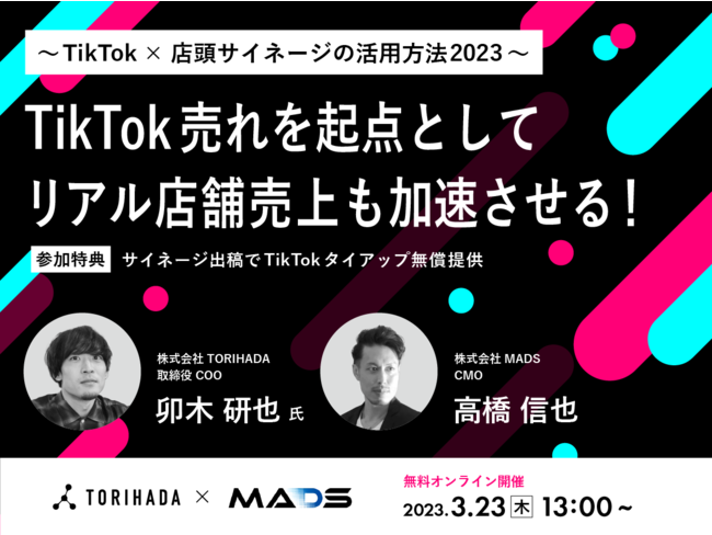 株式会社TORIHADA(本社:東京都渋谷区、代表取締役社長:若井映亮)は、株式会社MADSとともに「TikTok×店頭サイネージの活用方法2023」と題したウェビナーを2023年3月23日(木)13時に開催いたします。