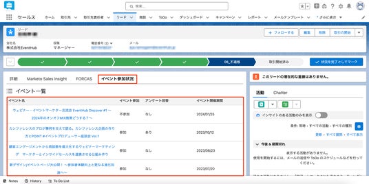 Salesforceのリードまたは取引先責任者の詳細画面よりイベントごとのEventHubのデータを確認することができます。
