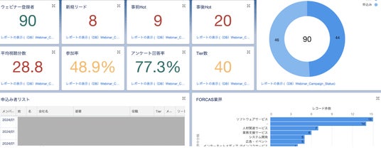 また、Salesforceのダッシュボード作成機能を利用すると、イベントやウェビナーの開催結果を以下のようなダッシュボードで可視化させながら振り返ることが可能です。