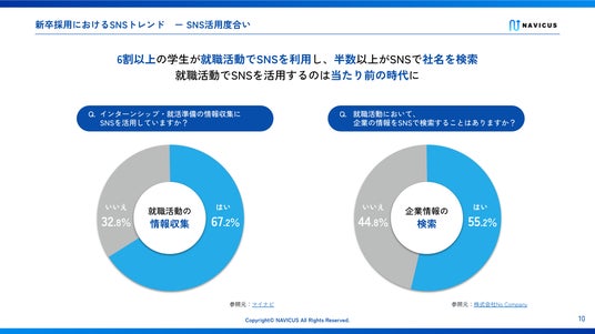 個人のコミュニケーションツールとして誕生したSNSも、昨今では政治や選挙に影響を及ぼすなど、年代問わず社会的な情報発信・収集ツールとして発展しています。SNSネイティブと称されるZ世代の就職活動においてもその影響力は如実に表れており、今や6割以上の学生が就職活動でSNSを利用し(*1)、半数以上が選考に関わる社名をSNSで検索しているという調査結果も出ています。また、SNS上で目にする情報は学生の入社意向の向上や意思決定にも作用しています(*2)。