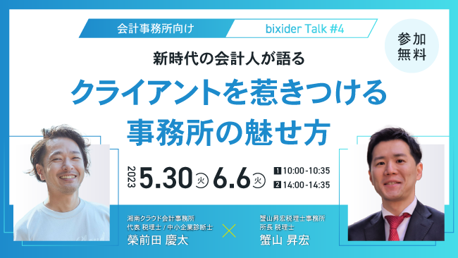 経営判断の“次の一手”を加速させる経営支援クラウド『bixid(ビサイド)』を提供する株式会社YKプランニング(本社:山口県防府市、代表取締役:岡本 辰徳)は、5月30日(火)および6月6日(火)に、会計事務所業界に携わる2名の講師をお招きした特別対談企画『新時代の会計人が語る、クライアントを惹きつける事務所の魅せ方』を配信いたします。