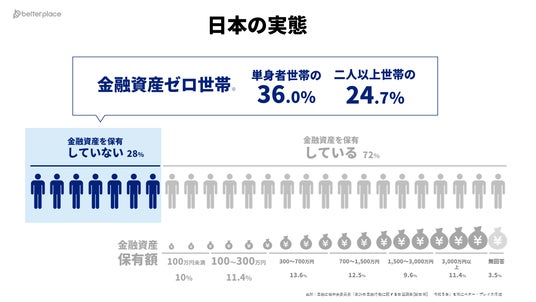 現在日本では、金融資産ゼロ世帯が単身者世帯の36.0% 、二人以上世帯の24.7%を占めるという現状があります。*¹