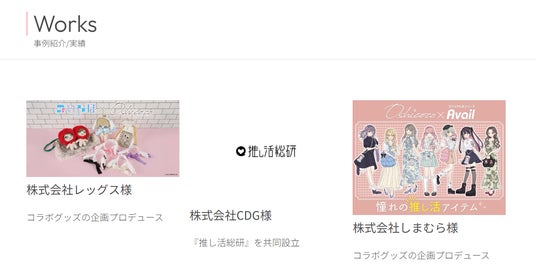 【主な事例】株式会社しまむら様 アパレルブランド「アベイル」とのコラボ商品をプロデュース株式会社ハンズ様 共同イベント開催を企画プロデュース積水ハウス梅田オペレーション株式会社様 「梅田スカイビル」フォトスポット・推し活グッズ販売スペースの企画プロデュース株式会社CDG様 「推し活総研」を共同設立株式会社メルカリ様 「超推し活展」企画監修を担当株式会社レッグス様 ぬい活&推し活サポートグッズブランド「ぬいらぼ」コラボ商品をプロデュースその他、出版社・ゲーム企業・ライブ配信企業等、多岐に渡る業種の企業様とお取組みをさせていただいております。