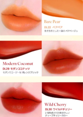 マットなベルベットテクスチャーで塗り始めると、時間が経つにつれて果汁のようなツヤがにじみ出し、セミベルベットな仕上がりに変化します。