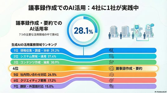 「議事録作成・要約」での生成AI活用率が28.1%に達し、1会議あたり約2時間の工数削減が試算されることが明らかになりました。あわせて、主要ツールの比較・導入時の注意点を網羅したガイドをメディアブログにて公開しております。