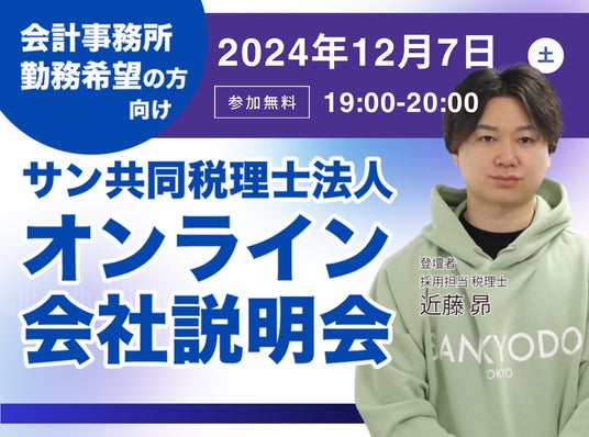 サン共同税理士法人(本社:東京都港区、代表社員: 朝倉 歩)は、2024年12月7日(土)19時00分よりオンライン会社説明会を開催いたします。