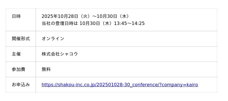 “次の一手”がデータでわかるMA+SFA一体型ツール「Kairos3(カイロススリー)」を提供するカイロスマーケティング株式会社(本社:東京都渋谷区、代表取締役:佐宗 大介、以下「当社」)は、株式会社シャコウ主催オンラインカンファレンス「BtoB Sales Marketing Conference 2025 AIで変わる現場に、本質から向き合う3日間」に登壇することをお知らせします。