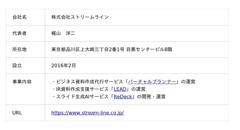 https://www.virtual-planner.com/ir/株式会社ストリームラインについて株式会社ストリームラインは「コミュニケーションの合理化で、ビジネスを進化させる」という理念を掲げ、2016年に資料作成代行サービス「バーチャルプランナー」、2021年にはIR資料に特化した作成支援サービス「LEAD」の提供をそれぞれスタートしました。