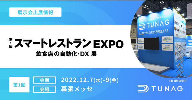 株式会社スタメン(本社:愛知県名古屋市、代表取締役:加藤 厚史)が自社で開発・提供する、エンゲージメントプラットフォーム「TUNAG(ツナグ、 https://tunag.jp/ja/ )」は、RX Japan株式会社(本社:東京都新宿区、代表取締役社長:田中 岳志)主催の「第1回スマートレストランEXPO」(2022年12月7日(水)~9日(金))に出展することをお知らせいたします。