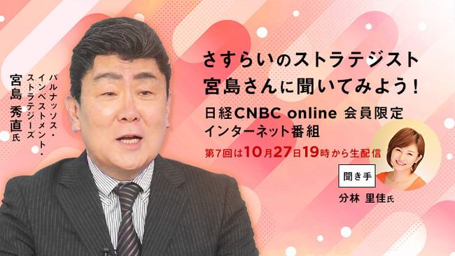 株式会社日経CNBC(本社:東京都千代田区、代表取締役社長:竹之内源市、以下「日経CNBC」)はインターネット限定番組「さすらいのストラテジスト 宮島さんに聞いてみよう!」第7回を配信します。日経CNBC onlineの会員向けで、10月27日(金)19時から配信予定です。