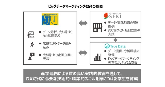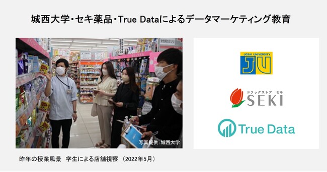 現代社会が求める人材の育成に取り組む学校法人城西大学(所在地:埼玉県坂戸市、学長:藤野 陽三、以下 城西大学)と、埼玉県を中心に約300店舗展開し地域に密着したドラッグストア・調剤薬局を展開している株式会社セキ薬品(本社:埼玉県南埼玉郡宮代町、代表取締役会長:関 伸治、代表取締役社長:関 善夫、以下 セキ薬品)、ビッグデータプラットフォームを運営する株式会社True Data(本社:東京都港区、代表取締役社長:米倉 裕之、以下True Data)の3者は、産学連携で城西大学の学生へのビッグデータマーケティング教育を実施いたします。この取り組みは2022年度に続き2回目となります。