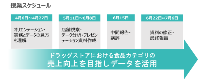このプログラムでは、学生がビッグデータを活用し、セキ薬品の店舗を視察した上で、実際の売り場づくりや、店頭販促施策を企画立案します。売り上げ拡大を目的に「レトルト調理品」、「即席めん」を取り上げ、地域のお客様が商品を選びやすく、欲しい商品に出会え、新たに欲しい商品にも気付けるような売り場づくりを学生が提案します。データ分析においては、ビッグデータマーケティングの手法を活用し、セキ薬品の購買データと、True Dataの生活者ビッグデータを重ね合わせて読み解きます。