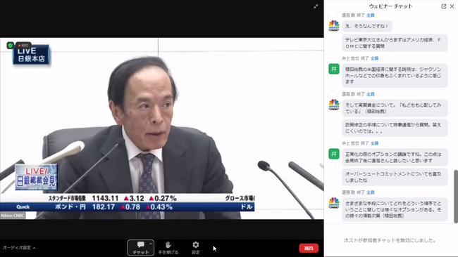 開催当日の15:20からプレトークを行い、総裁会見が始まる15:30から会見終了まで、Zoomのチャット機能を使ってリアルタイムで解説します。同時に配信する植田総裁の映像を視聴しながら、専門家の解説を文字情報で確認することができます。