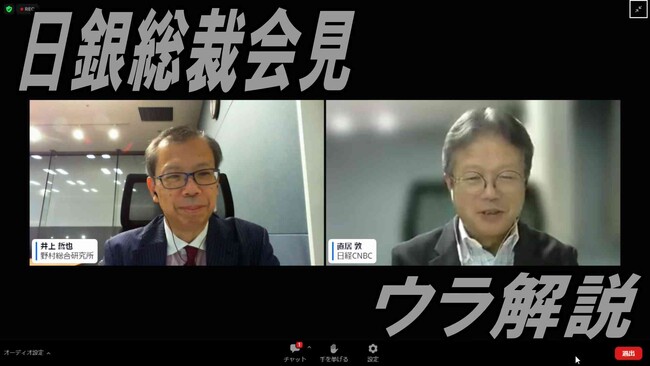 日銀の植田総裁による会見を元専属スタッフの井上哲也氏と日経CNBCの直居敦がリアルタイム解説!日経CNBCが「LIVE!日銀総裁会見『ウラ解説』」第5回を配信