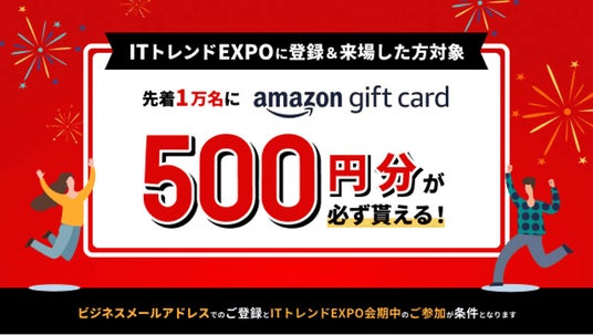 また、ITトレンドEXPO2025 Springでは、 Amazonギフトカード500円分をもれなくプレゼントするキャンペーンを実施中です。 下記URLよりビジネスメールアドレスを利用して登録し、会期中に参加した場合、先着1万名にAmazonギフトカードがプレゼントされます。