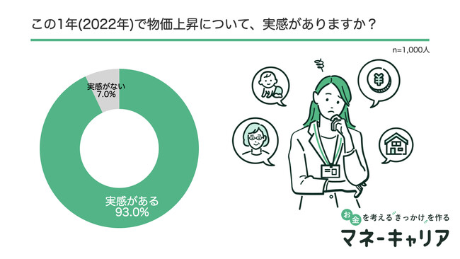 長引くコロナ禍やウクライナ侵攻など、様々な驚異が起こった2022年ですが、「あなたはここ最近の円安によって、お金に関する危機感を感じますか。」という質問に対して、危機感を「感じる」と答えた人は全体の87%に上り、「あなたはこの1年で物価上昇について、実感がありますか。」という質問には「実感がある」と答えた人は93%となり、約9割の人が、負担の増加を実感する結果となりました。