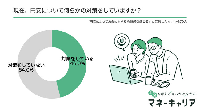 ここ最近の円安によって「お金に関する危機感を感じる」と回答された方へ「現在、円安について何らかの対策をしていますか。」という質問をすると約半数以上の人が「対策をしていない」と答え、危機感は感じつつも、どこに相談していいのかが不明だったり、何から手をつけていいのかわからない印象でした。