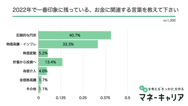 2022年で一番印象に残っているお金に関連する言葉を聞いたところ、「記録的な円安」が1位となりました。続いて、「物価高騰・インフレ」が2位、「貯蓄から投資へ」が3位となり、円安や物価高騰の危機で将来への投資意識が高まっている印象です。