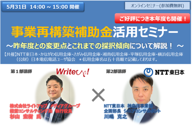 NTT東日本 神奈川事業部は、かながわ信用金庫、さがみ信用金庫、湘南信用金庫、平塚信用金庫、横浜信用金庫、日本電信電話ユーザ協会と共に、事業再構築補助金活用セミナーを開催します。