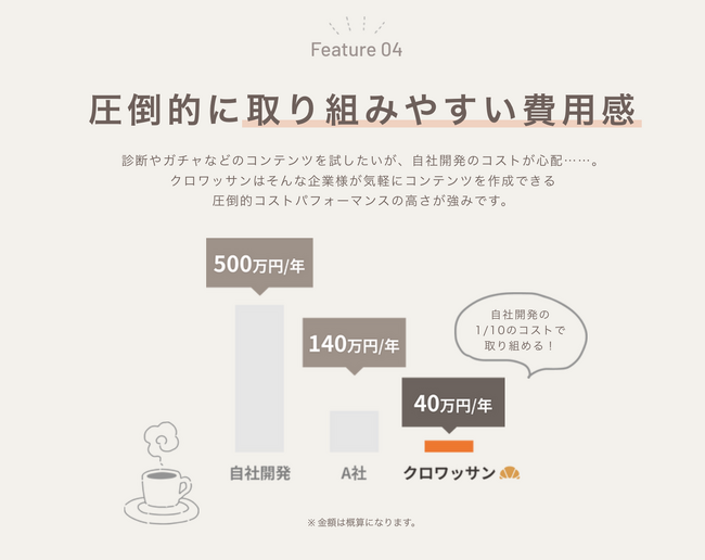 クロワッサンは、そのような企業様が気軽にコンテンツを作成できるよう、圧倒的なコストパフォーマンスの高さを実現いたしました。