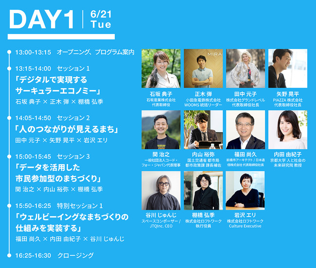 人材育成、データ活用、地域経済、循環型経済、地域活性化などの切り口で、有識者やまちづくりの実行者によるディスカッションを行います。また、今まさに未来に向けて場づくり、仕組みづくりにチャレンジしようとしている
