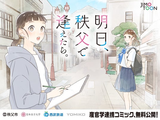 JIMOTOONのコミック第一弾である『明日、秩父で逢えたら。』は、YOMIKOが実施した日本女子大学のJWU社会連携科目の授業内ワークショップにおいて、秩父市、西武鉄道の協力のもと、産官学連携によって制作されました「縦スクロールコミック」です。2月13日(火)よりCIVICPRIDEポータルサイト内特設サイト(URL:
