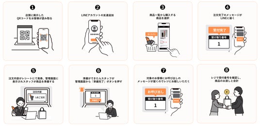 ユーザーはLINEを活用したスマートフォン上から簡単に事前注文を行い、商品の用意完了通知を受け取りレジにて注文番号を提示するだけで、会計列の混雑や待ち時間を回避し、即時に商品を受け取ることができます。