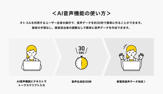 <AI音声機能の使い方>オトコルを利用するユーザー自身の操作で、音声データを約30秒で簡単に作ることができます。※音声生成の際に参考となる音声データの入力が必要です。