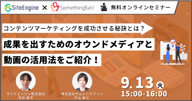 「自己表現にテクノロジーとアイデアを」を経営理念としてWebマーケティング支援サービスを提供するサイトエンジン株式会社(本社:東京都世田谷区 代表取締役:毛塚 智彦)は、2022年9月13日(火)15:00~16:00に、株式会社サムシングファン(本社:東京都千代田区 代表取締役:薮本 直樹)との” コンテンツマーケティングを成功させる秘訣とは?成果を出すためのオウンドメディアと動画の活用法をご紹介!” を開催します。